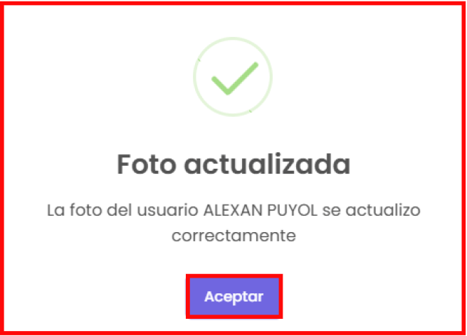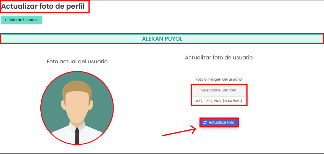 “Actualizar foto de perfil”: se cuenta con una funcionalidad para actualizar la foto de perfil de los usuarios, permitiendo visualizar la imagen actual y subir una nueva en formato JPG, JPEG o PNG (máximo 5MB). Puedes ver un ejemplo en la siguiente imagen: