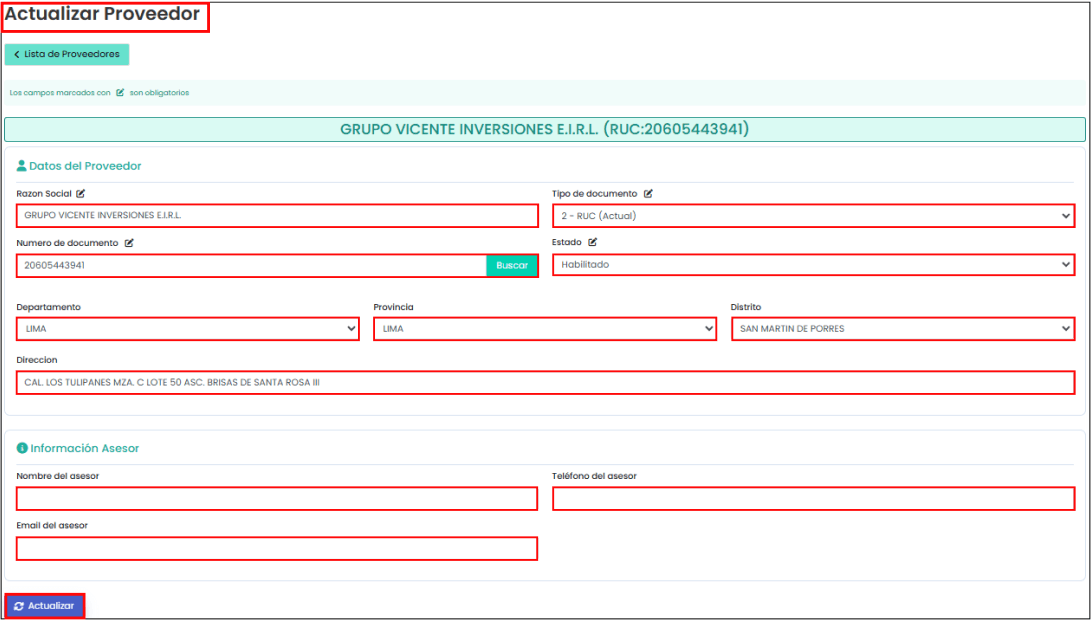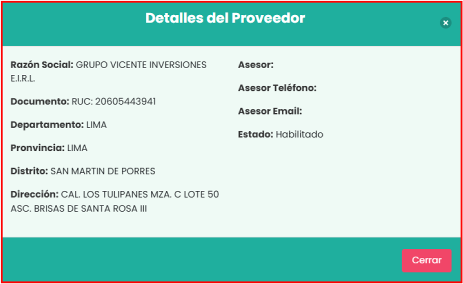 Al hacer clic en el botón “Detalles”, te mostrará todos los datos del proveedor que hayas seleccionado. En la siguiente imagen puedes visualizar los datos correspondientes: