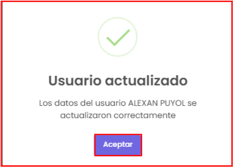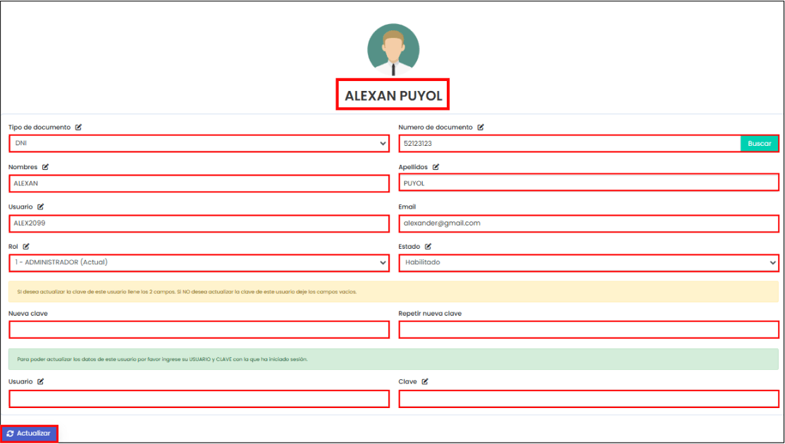 Al hacer clic en el botón “Actualizar”, te mostrará todos los campos del usuario que podrás modificar. En la siguiente imagen puedes visualizar los campos correspondientes: