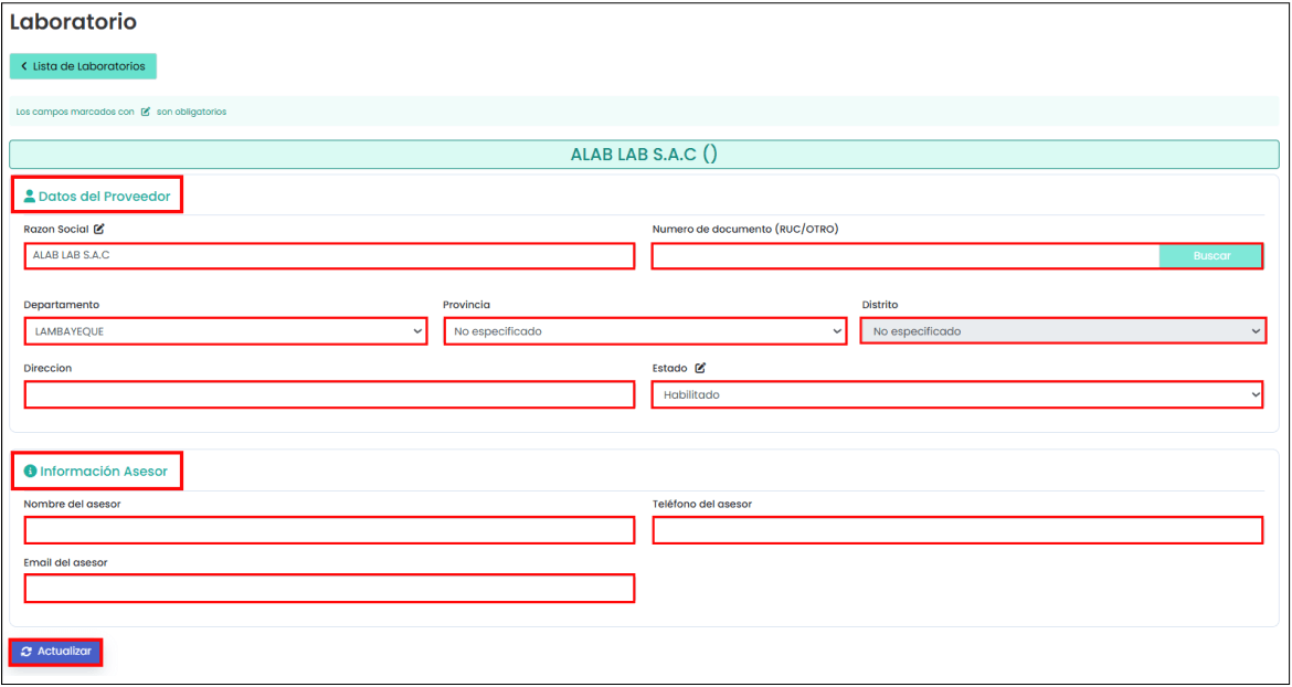 Al hacer clic en el botón “Actualizar”, te mostrará todos los campos del laboratorio que podrás modificar. En la siguiente imagen puedes visualizar los campos correspondientes: