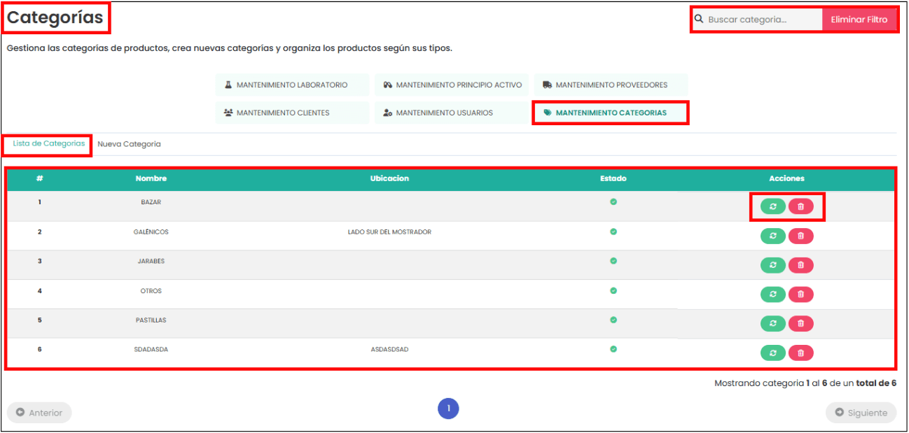En esta sección podrás gestionar las categorías de productos, registrar nuevas y actualizar las existentes. En la vista principal se muestra una tabla con la siguiente información: número, nombre de la categoría, ubicación dentro del establecimiento, estado (activo/inactivo) y acciones disponibles (editar, eliminar).