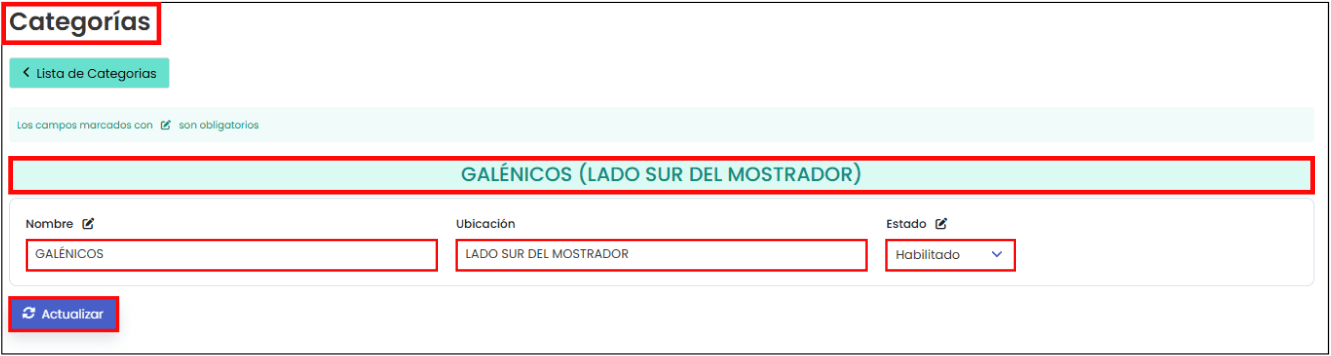 Al hacer clic en el botón “Actualizar”, te mostrará todos los campos de la categoría que podrás modificar. En la siguiente imagen puedes visualizar los campos correspondientes: