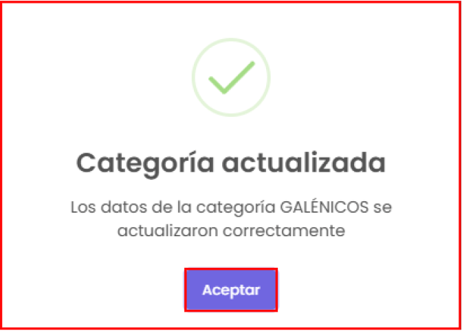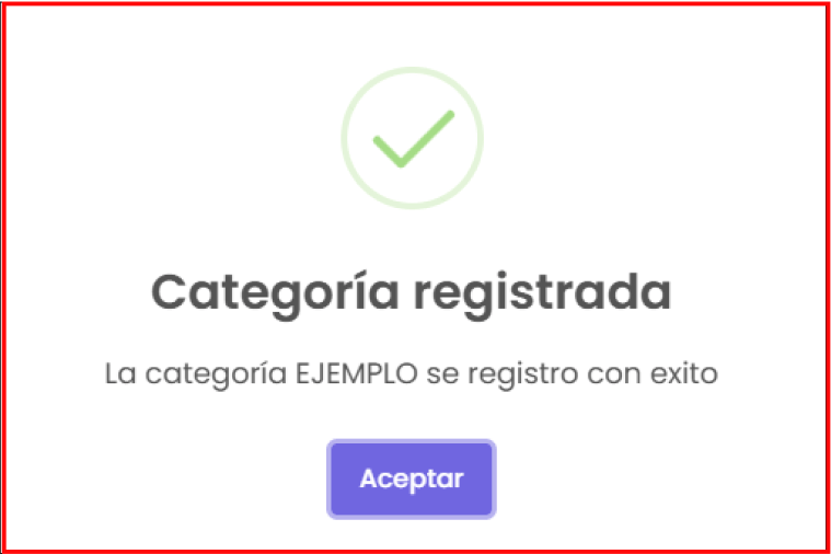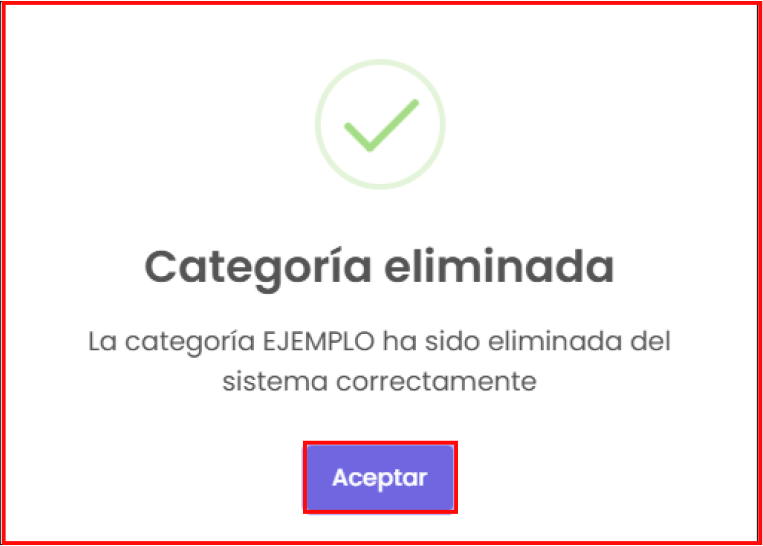 Botón de “Eliminar”: te permite eliminar la que hayas seleccionado. Al hacer clic, te mostrará una confirmación sobre si estás seguro de eliminarla. Si quieres seguir con la eliminación de la categoría, haz clic en el botón de “Sí, realizar”; en caso contrario, haz clic en el botón de “No, cancelar”.