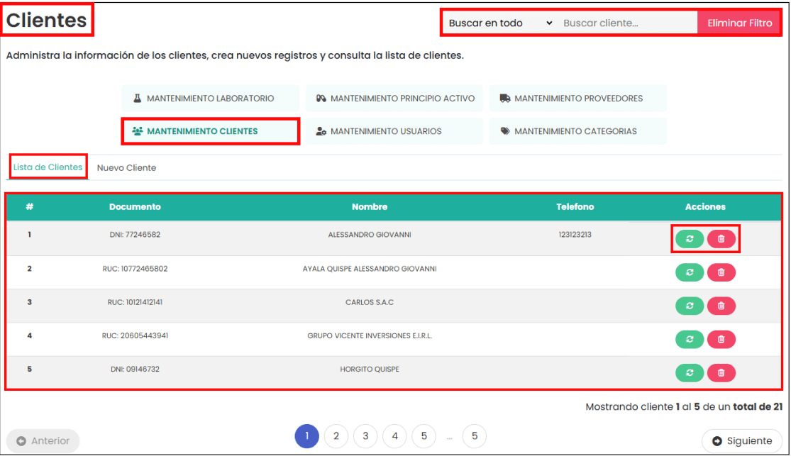 Botón de “Eliminar”: te permite eliminar el cliente que hayas seleccionado. Al hacer clic, te mostrará una confirmación sobre si estás seguro de eliminarlo. Si quieres seguir con la eliminación del cliente, haz clic en el botón de “Sí, realizar”; en caso contrario, haz clic en el botón de “No, cancelar”.