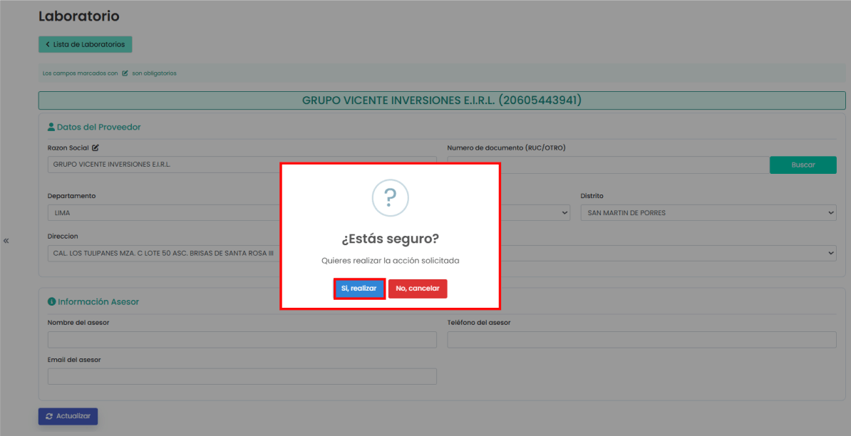 Para guardar los cambios que desees, es necesario llenar los campos que están marcados como obligatorios. Cuando estén todos los campos completos, haz clic en el botón de actualizar y te dará una confirmación para saber si estás de acuerdo con que se apliquen los cambios. Si quieres que se apliquen, solo tienes que hacer clic en el botón de “Sí, realizar”; en caso contrario, haz clic en el botón de “No, cancelar”.