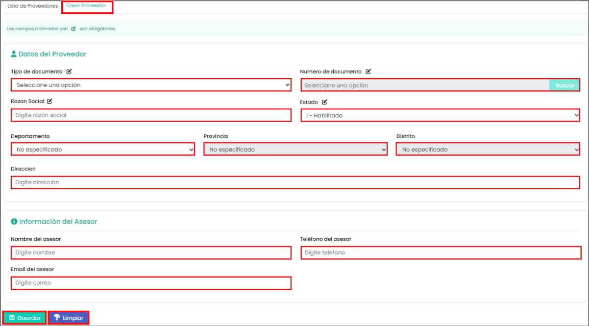 “Crear proveedor”: En la imagen posterior se puede ver que aparecen los campos para rellenar de un proveedor. Para crear uno nuevo debes completar los campos que están marcados con un ícono al lado y hacer clic en el botón de “Guardar”.