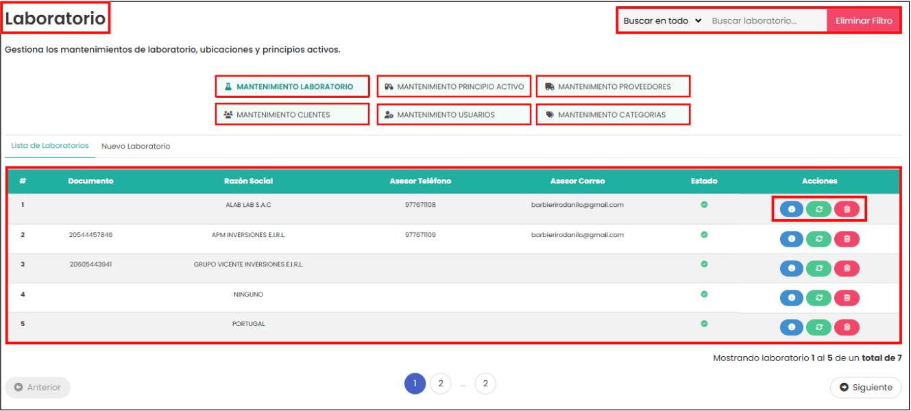En esta sección se puede gestionar información de laboratorios, ubicaciones, principios activos, proveedores, clientes y usuarios. A continuación, se da una vista de la primera opción, que es “Mantenimiento laboratorio”, en la siguiente imagen: