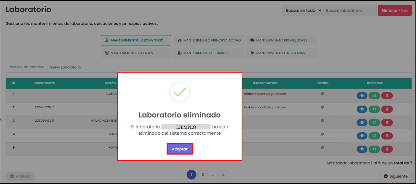 Botón de “Eliminar”: te permite eliminar el laboratorio que hayas seleccionado. Al hacer clic, te mostrará una confirmación sobre si estás seguro de eliminar el laboratorio seleccionado. Si quieres seguir con la eliminación del laboratorio, haz clic en el botón de “Sí, realizar”; en caso contrario, haz clic en el botón de “No, cancelar”.