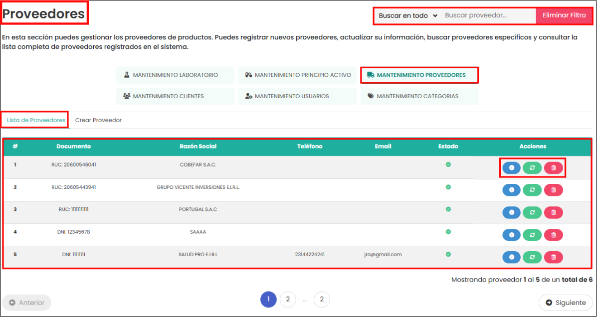 Se muestra una tabla con columnas como número, documento (RUC o DNI), razón social, teléfono, correo electrónico, estado (activo/inactivo) y acciones para ver detalles, editar o eliminar un proveedor. También incluye funcionalidades de búsqueda avanzada, eliminación de filtros, paginación y acceso a otros módulos del sistema. Facilita una gestión ordenada y eficiente de los proveedores registrados.