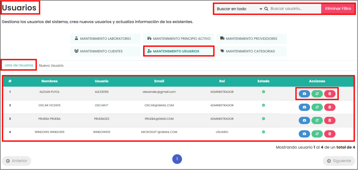 _ Utiliza el “filtro de busqueda” para obtener con mas facilidad el resultado que quieres visualizar en el cuadro . Tambien puedes visualizar al lado el boton de “Eliminar filtro” , en donde podras borrar el campo que has rellenado para una busqueda mas especifica.