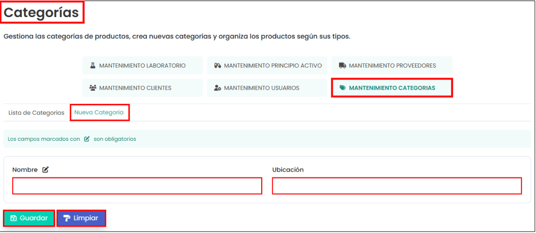 “Nueva categoría”: En la imagen posterior se puede ver que aparecen los campos para rellenar. Para crear una nueva categoría debes completar los campos que están marcados con un ícono al lado y hacer clic en el botón de “Guardar”.