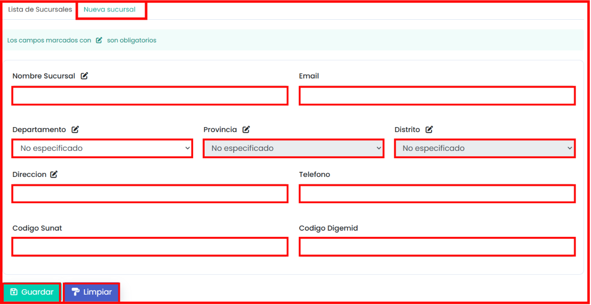 _ “Nueva sucursal” : permite registrar una sede afiliada a la empresa. El usuario debe completar datos básicos como nombre, correo, ubicación (departamento, provincia y distrito), dirección, teléfono y los códigos oficiales (SUNAT y DIGEMID). Al finalizar, puede guardar la información o limpiar el formulario para reiniciar el registro.
