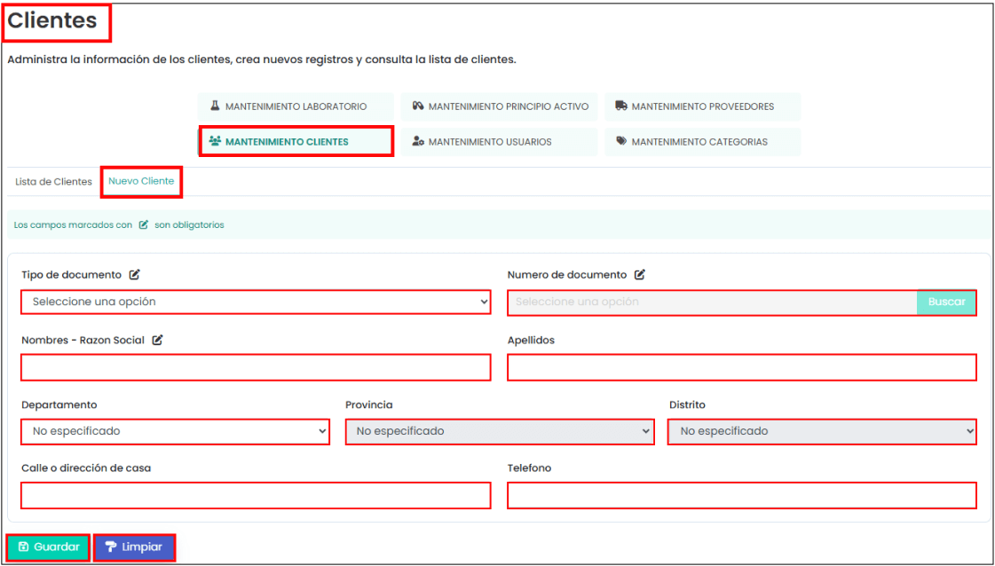 “Nuevo cliente”: En la imagen posterior se puede ver que aparecen los campos para rellenar de un cliente. Para crear uno nuevo debes completar los campos que están marcados con un ícono al lado y hacer clic en el botón de “Guardar”.