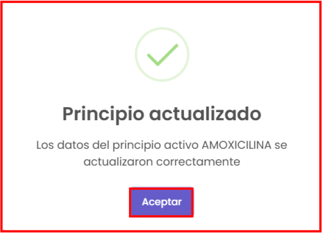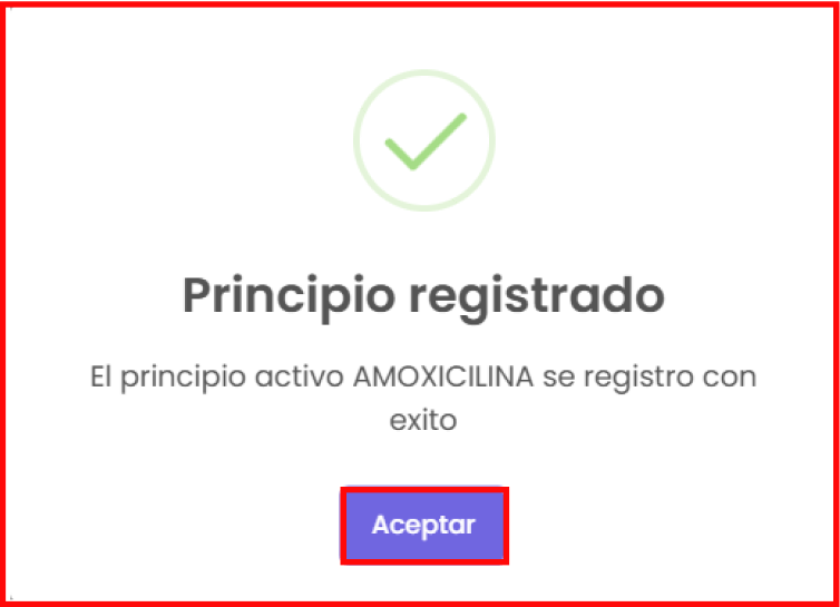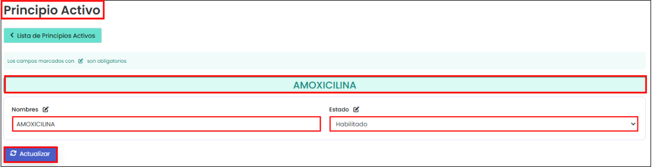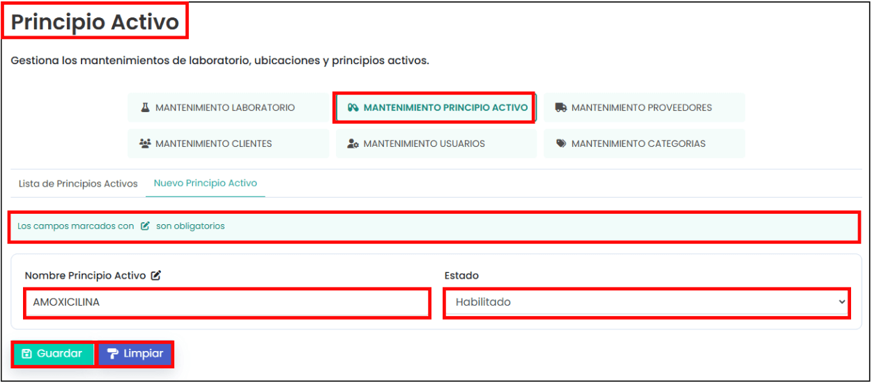 “Nuevo principio activo”: En la imagen posterior se puede ver que aparecen los campos para rellenar de un principio activo. Para crear uno nuevo debes completar los campos que están marcados con un ícono al lado y hacer clic en el botón de “Guardar”.