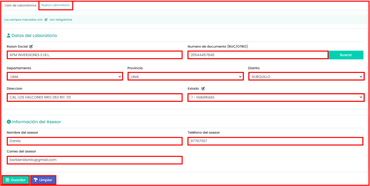 “Nuevo laboratorio”: En la imagen posterior se puede ver que aparecen los campos para rellenar de un laboratorio. Para crear un nuevo laboratorio debes completar los campos que están marcados con un ícono al lado, y hacer clic en el botón de “Guardar”.