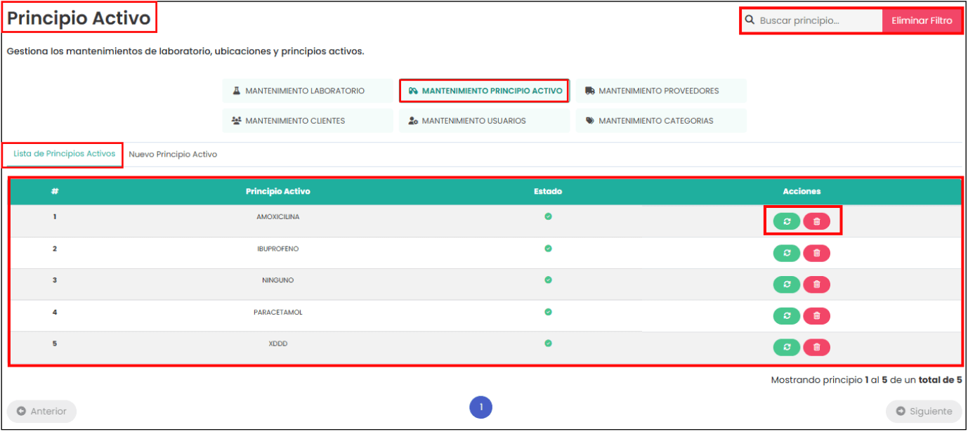 También cuenta con funciones de búsqueda, paginación, eliminación de filtros y navegación hacia otros módulos de mantenimiento como laboratorio, ubicación, proveedores, clientes y usuarios. Facilita la administración centralizada y eficiente de los principios activos del sistema.