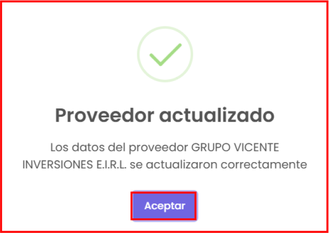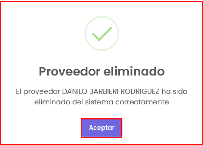 Botón de “Eliminar”: te permite eliminar el proveedor que hayas seleccionado. Al hacer clic, te mostrará una confirmación sobre si estás seguro de eliminar el proveedor seleccionado. Si quieres seguir con la eliminación del proveedor, haz clic en el botón de “Sí, realizar”; en caso contrario, haz clic en el botón de “No, cancelar”.