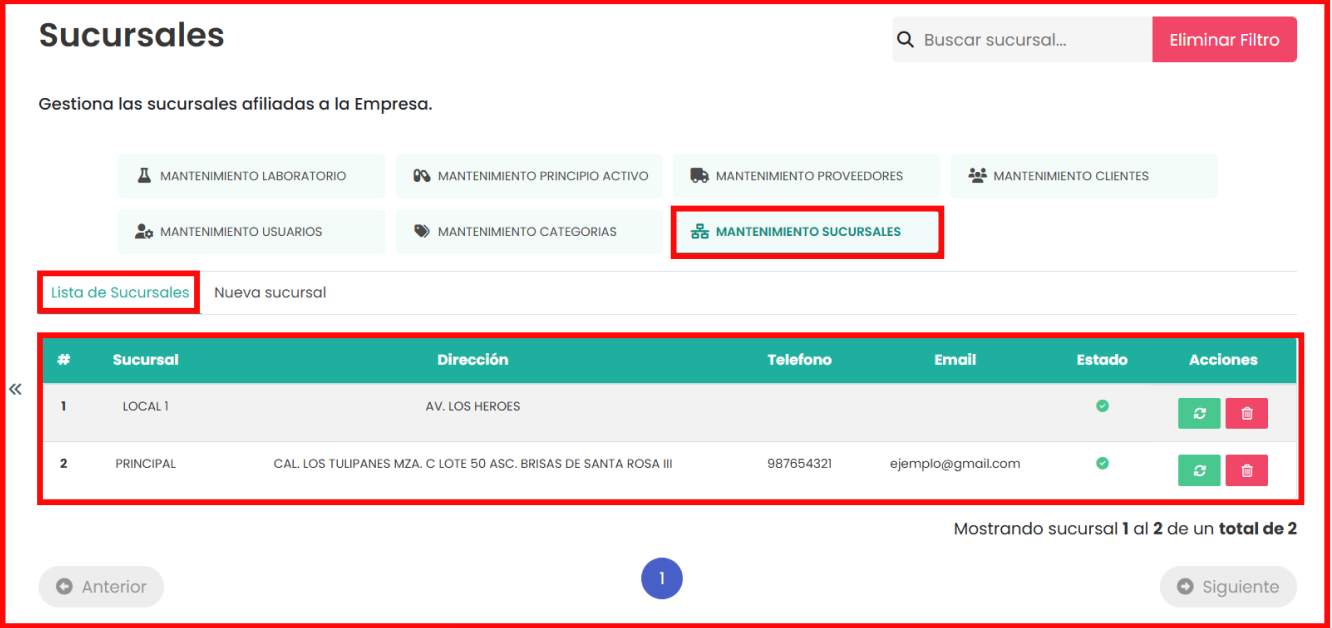 En esta sección , el sistema permite gestionar las distintas sedes afiliadas a la empresa. Al ingresar, se muestra una tabla con el listado de sucursales registradas, incluyendo datos como nombre, dirección, teléfono, correo electrónico, estado y acciones disponibles. Desde esta vista, el usuario puede editar o eliminar cada sucursal mediante los botones correspondientes. Además, la pestaña "Nueva sucursal" permite registrar una nueva sede completando un formulario con los siguientes campos: nombre de la sucursal, email, ubicación (departamento, provincia, distrito), dirección, teléfono, y códigos SUNAT y DIGEMID. Una vez llenados los campos obligatorios, se puede guardar la información mediante el botón Guardar o restablecer el formulario con Limpiar. Esta funcionalidad facilita el control y la expansión estructurada de la red de sucursales dentro del sistema.