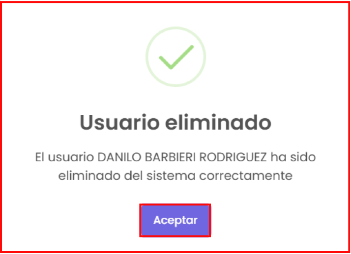 Botón de “Eliminar”: te permite eliminar el usuario que hayas seleccionado. Al hacer clic, te mostrará una confirmación sobre si estás seguro de eliminarlo. Si quieres seguir con la eliminación del usuario, haz clic en el botón de “Sí, realizar”; en caso contrario, haz clic en el botón de “No, cancelar”.